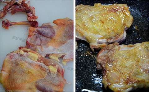 2、煎制鸡大腿时,鸡皮一面朝下,锅中不用放油,中小火慢煎将鸡肉中的油脂慢慢煎出来就好。
