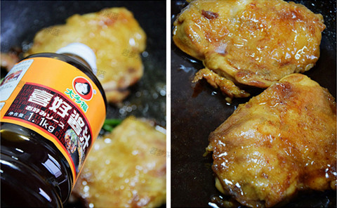 3、鸡腿里的肉脂煎出来后,2面煎成金黄色时,将香葱入锅,再将100克的大多福喜好酱汁烹入锅中。