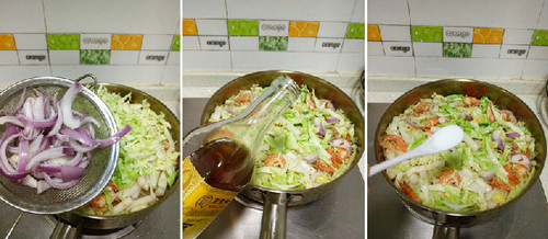 3、再将包菜丝及洋葱下锅,微炒一下后再加入料酒及细盐调味,炒至年糕包菜熟透即可。