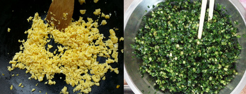 5、鸡蛋加入韭菜馅中,试一下咸淡味(淡了可以加点生抽或盐),然后拌匀。