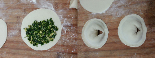 7、取一面剂,擀成圆形,适量的韭菜鸡蛋馅放上,面片对折包上,收口处捏紧。