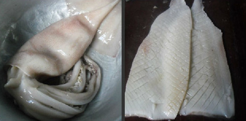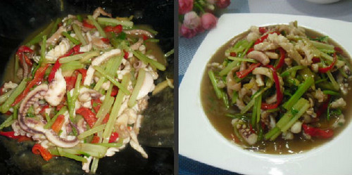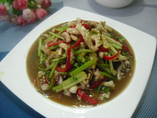 主料:鲜鱿鱼1条,芹菜,红椒,姜