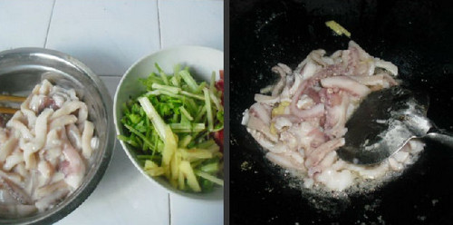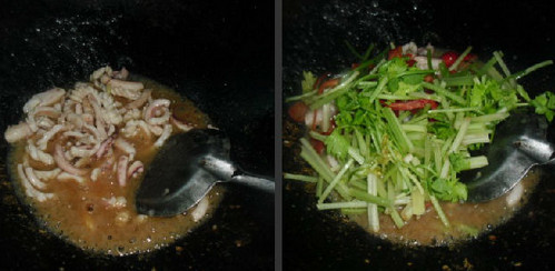4、炒锅烧热倒油,放入鱿鱼姜丝迅速炒散。