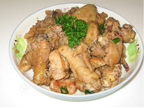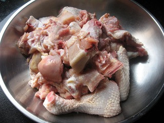 1、光鸡洗干净,剁块。用盐和料酒腌20分钟。(刀工不好,每次剁鸡都脱皮脱骨的,亲们就将就着看吧。)