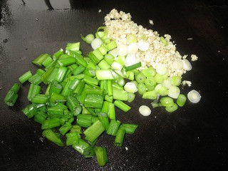 2、沙姜去皮剁碎,葱切葱花。