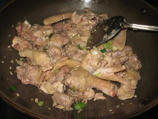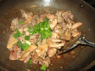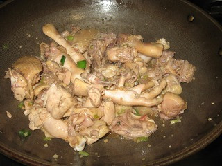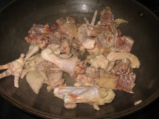 3、热油锅,把鸡爆炒至变色。