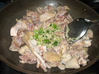 4、把鸡推到锅边,爆香沙姜和葱白。
