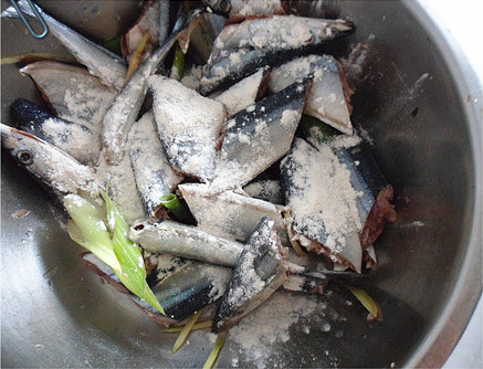 2、腌好的秋刀鱼沾干面粉。