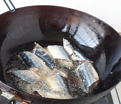 3、将秋刀鱼放热油里煎制。放打料瓣去腥。