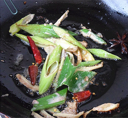 5、葱姜干红椒炝锅。