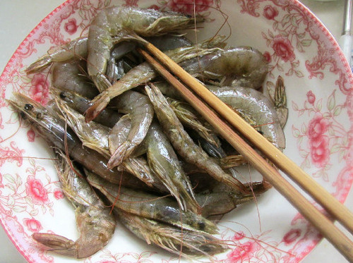 1、把虾化开,剪去长须加盐腌渍5分钟。(我这个图片还没剪长须)。