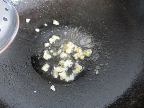 3、锅里流一点油,下入蒜米煸炒。