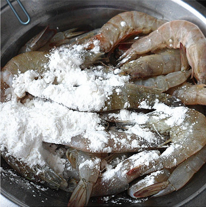1、将虾收拾干净,拍少许淀粉。