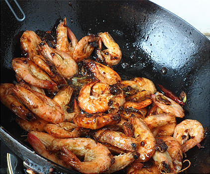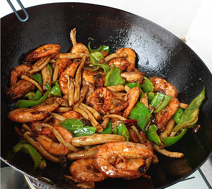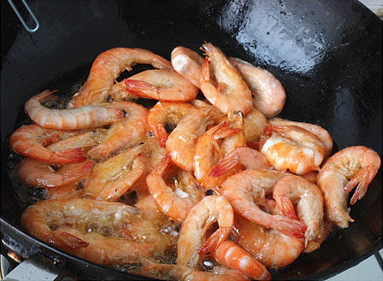 7、放入虾,烹入料酒,生抽,白糖,少许盐,翻炒入味。