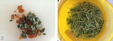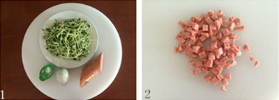 1、准备食材:黑豆苗、火腿、松花蛋、浓汤宝。