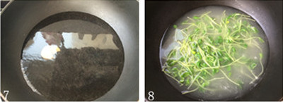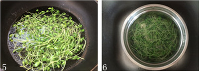 1、沸水加一滴油,把黑豆苗焯烫,焯烫不但可以去除豆腥味,还因为之后的淋冷水,保持豆苗的翠绿颜色。