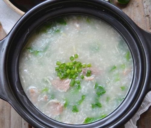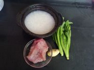 主料:大米粥1大碗,瘦猪肉100g,芥菜2棵