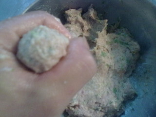 2、丸子的关键在打上,顺一个方向搅打,打的发粘,发白。上劲越紧,丸子越光滑,越有嚼劲。