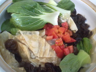 配料:香菜(根据个人爱好),木耳(6片),小青菜(两颗),番茄(半个)