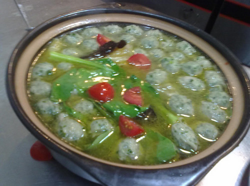 5、等丸子都~起加入,盐,鸡粉,鸡汁,味精调味,再加入木耳,青菜番茄丁,烧开。丸子熟透盛入器皿浇少许鸡油即可。