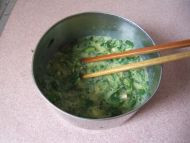 3、将香菜碎和蛋液混合一起,加适量盐和几滴白酒拌匀。