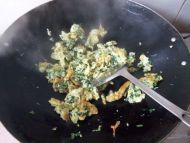 这道香菜炒鹅蛋的做法特别简单,而且营养也非常丰富。这道香菜炒鹅蛋是用香菜,鹅蛋制作而成,要先把鹅蛋打散了,在把香菜切碎了以后放进去,就像大家做炒葱花蛋一样。放完香菜以后要放一点点盐再放几滴白酒,这样能去腥味,然后再下锅去炒。