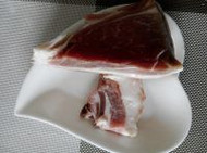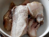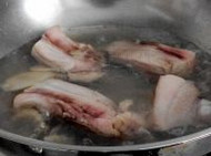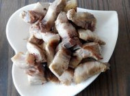 2、清洗后切成条块用凉水加料酒浸泡二十分钟左右。