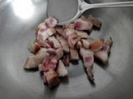 6、锅烧热,不放油,放入切好的野猪肉块,爆炒至表面微微变色出油,看着挺肥的野猪肉,几乎没有多余的油下来,看来野猪肉可以多吃。