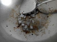 8、锅内加少量的底油,加入冰糖,小火慢慢炒化。