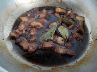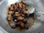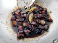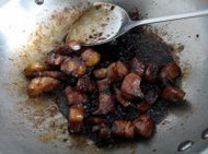 9、待冰糖液颜色变深时,倒入炒过的野猪肉块翻炒。
