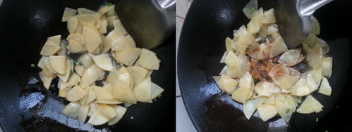 4、加入蚝油、生抽、花椒粉,翻炒均匀。土豆片不好成熟,要多炒一会。