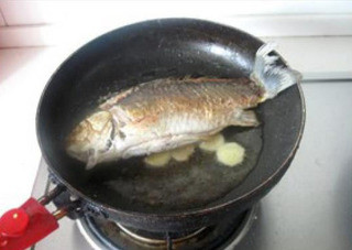 3、煎至两面呈金黄色,(煎的过程中火力不能小,要中火、中大火相互转换为宜,将两面煎成金黄色),依次加入大葱片、姜片。