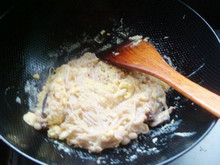 6、倒入鸡蛋液翻炒。