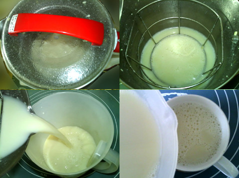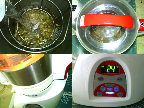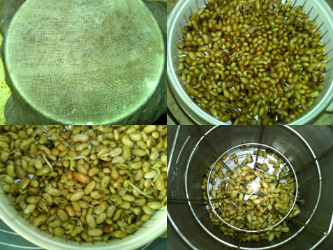 1、豆洗净,放入微波蒸盘中,加入适量水,使水刚好没过蒸盘底部,将黄豆铺平,盖上湿屉布。第二天,黄豆涨发,每天换三次水,三天后,黄豆长出参差不齐的豆芽。将豆芽嘴儿倒入豆腐机打浆桶。