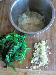 4、海蜇冲洗赶紧沥干水分,蒜瓣切末,菠菜切段。