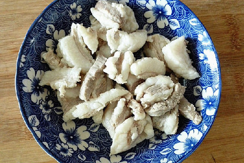 4、在浸泡的时候可以将五花肉切片并绰水备用。