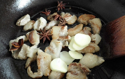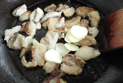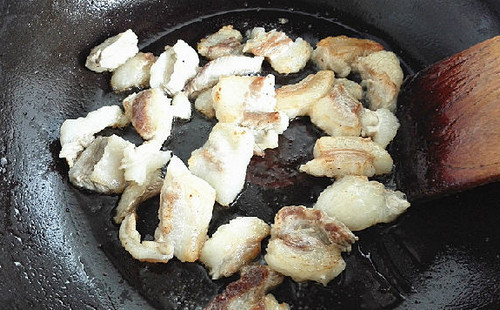 6、将绰水后的五花肉放在炒锅中煸炒成金黄色,且有油水渗出。
