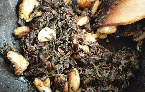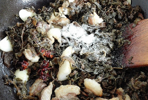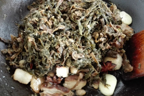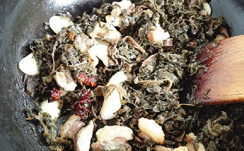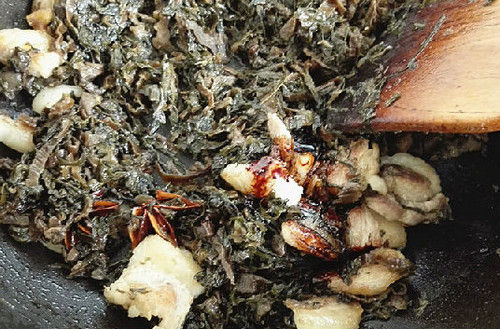 10、继续翻炒,使梅干菜充分吸收五花肉的油。