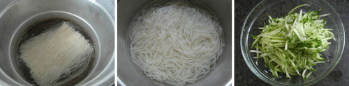 1、锅内加足够的水,烧开下入面条,煮至无白芯。提前晾好凉开水,将面条在里面过凉。一来是让面条降温,二来是面条筋道。黄瓜洗净,擦丝备用。