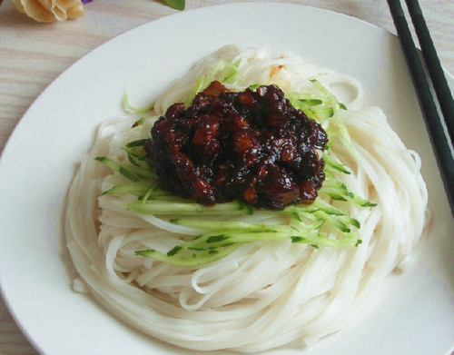 3、肉酱拌凉面,制作很简单,有肉有菜,吃起来还清凉。