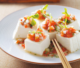 1、将牛番茄横切约1公分的圆片;鸡蛋豆腐切成约1公分的四方片状备用。