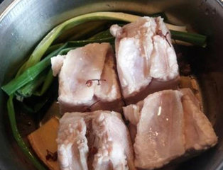4、将五花肉皮朝下置于炖锅内,将青葱、姜片、花椒粒和酱料倒入锅里,最后再加水盖超过肉。