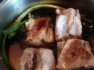 配料:葱适量,姜片2片,八角1颗,花椒粒少许,绍兴酒半碗,酱油半碗,咖喱炒酱1大匙,冰糖2大匙,蚝油1大匙