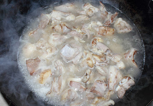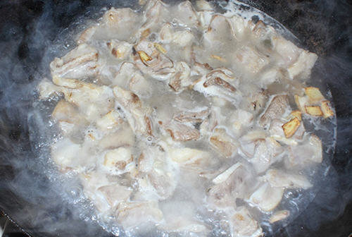 3、炒锅洗净,烧热放一点油,先煸姜片至有些焦黄,接着下羊腩炒几下,倒热水烧开