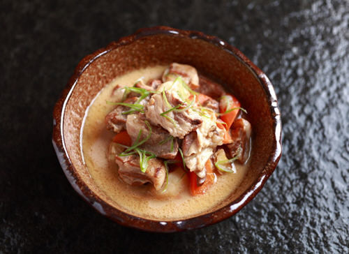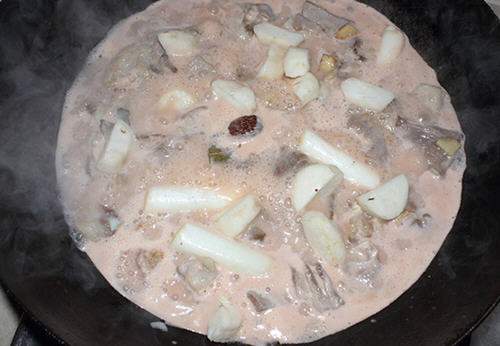 4、将打匀的腐乳倒进锅中,放所有香料和葱段,再放马蹄,最后倒黄酒烧开后盖锅盖小火焖一个半小时左右