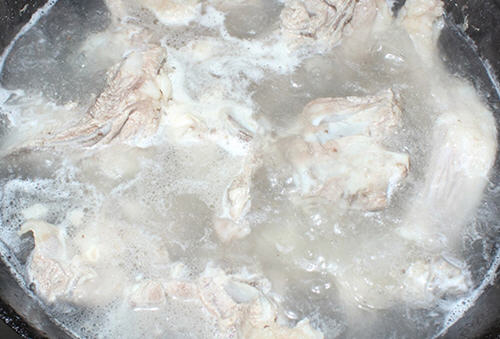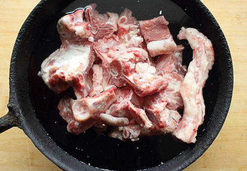 2.羊蝎子冷水下锅,煮开后及时撇去浮沫,稍微煮五分钟,让血水出净,关火备用