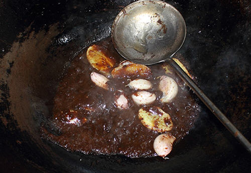 3.另取一口炒锅,倒适量油,烧七成热,下姜片和大蒜炸一下关小火,下泻开的黄酱中火炒至黄酱发亮,香气飘出