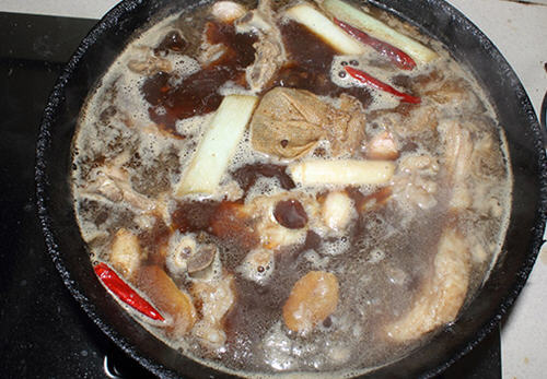 4.将旁边煮完的羊蝎子和汤一起倒进锅中,放葱段,酱油,黄酒,盐和冰糖烧开,盖锅盖小火慢煮一至一个半小时就可以了
