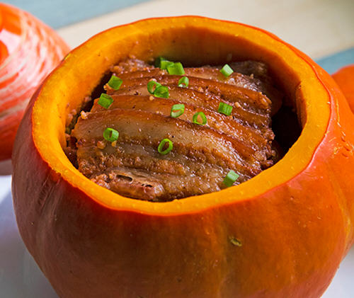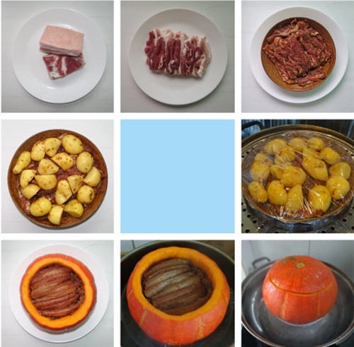 7、 将金瓜上部开盖、中间掏空,将蒸好的肉片反扣进金瓜内。