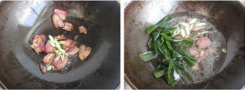 3煎至腊肉的肥油流出,放入葱姜丝炒香。